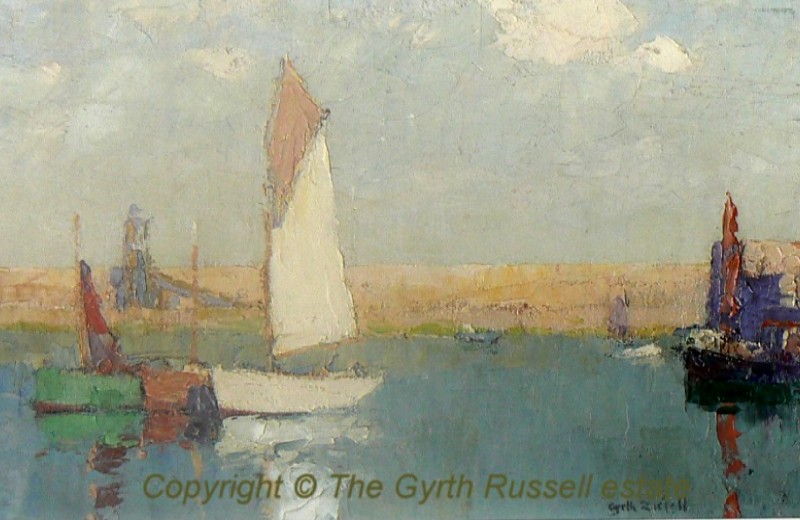 www.gyrth-russell.com - Limited Editions Presenting a select few of Gyrth Russells best works , on high quality watercolour paper using the `Giclee` printing process reported to have a lightfastness in excess of 100 years . Each print is supplied either unframed but with an acid-free overmount and cellophane wrapped or fully framed and ready to hang . Each print is numbered and comes with a certificate of authenticity from the Gyrth Russell estate. Title : `Blue and Gold` Breton boats in Mevagissey Harbour One of the simplest and best harbour scenes by Gyrth in his favourite Cornish town of Mevagissey. Most of Gyrths greatest works were inspired in this busy fishing harbour and here he captures the bright clear colour and warmth of a peaceful summers morning by the sea. Image size : 9.1/4 " x 14.1/4 " " ( 235 x 362 mm ) - Mount size : 16 x 20.1/2 " ( 406 x 520mm ) Original Medium : Oil on canvas - Limited edition of : 220 The frames available are either a Rich Dutch gold leaf finish with hints of the red base colour coming through or our hand-painted pastel grey finish with Dutch gold leaf inner edge again on a warm red base colour ( see `Rouen Cathedral porch` limited edition page) back to `Limited Editions` page..
