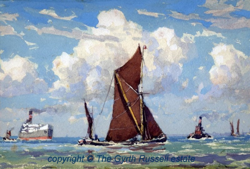 www.gyrth-russell.com - Limited Editions Presenting a select few of Gyrth Russells best works , on high quality watercolour paper using the `Giclee` printing process reported to have a lightfastness in excess of 100 years . Each print is supplied either unframed but with an acid-free overmount and cellophane wrapped or fully framed and ready to hang . Each print is numbered and comes with a certificate of authenticity from the Gyrth Russell estate. Title : `Shipping on the Thames estuary` This is a little gem of a watercolour - A bright and breezy day with busy shipping everywhere and a typical Thames barge to the forefront of the painting Image size : 5.1/4" x 8.1/2" " ( 133 x 216mm ) - Mount size : 11 x 13.1/2" ( 280 x 343mm ) Original Medium : Watercolour - Limited edition of : 250 The frames available are either a Rich Dutch gold leaf finish with hints of the red base colour coming through or our hand-painted pastel grey finish with Dutch gold leaf inner edge again on a warm red base colour ( See the` Rouen Cathedral porch` limited edition page ). back to `Limited Editions` page..