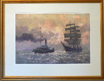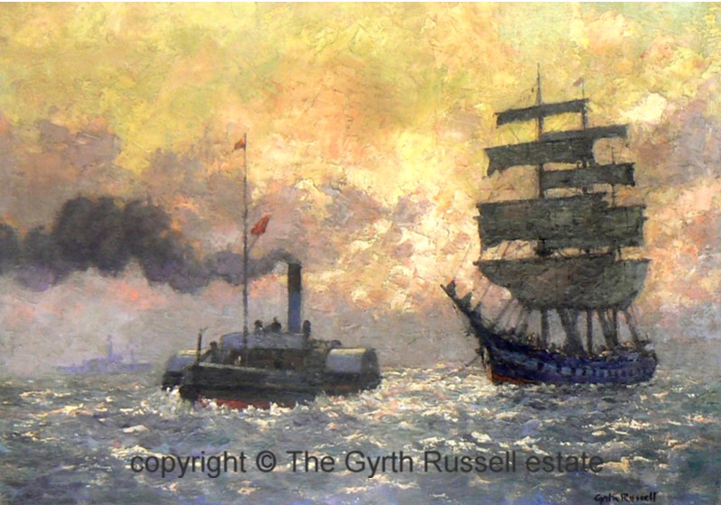 www.gyrth-russell.com - Limited Editions Presenting a select few of Gyrth Russells best works , on high quality watercolour paper using the `Giclee` printing process reported to have a lightfastness in excess of 100 years . Each print is supplied either unframed but with an acid-free overmount and cellophane wrapped or fully framed and ready to hang . Each print is numbered and comes with a certificate of authenticity from the Gyrth Russell estate. Title : `Journeys End ` A large , powerful and evocotive painting featuring the last steam-driven tug boat on the Mersey working beneath a vibrant and dramatic sunrise Image size : 16" x 23.1/2" ( 406 x 597mm ) - Mount size : 23.1/2 x 30.1/2" ( 406 x 775mm ) Original Medium : Oil on canvas - Limited edition of : 200 The frames available are either a Rich Dutch gold leaf finish with hints of the red base colour coming through or our hand-painted pastel grey finish with Dutch gold leaf inner edge again on a warm red base colour ( See the` Rouen Cathedral porch` limited edition page ). back to `Limited Editions` page..