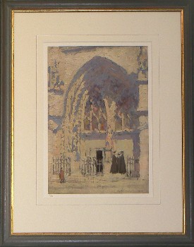 www.gyrth-russell.com - Limited Editions Presenting a select few of Gyrth Russells best works , on high quality watercolour paper using the `Giclee` printing process reported to have a lightfastness in excess of 100 years . Each print is supplied either unframed but with an acid-free overmount and cellophane wrapped or fully framed and ready to hang . Each print is numbered and comes with a certificate of authenticity from the Gyrth Russell estate. Title : `Rouen Cathedral porch` This shimmeringly beautiful little oil painting shows the strong influence of Monet who was teaching in Paris whilst Gyrth attended the Acadamie Julian and Acadamie Calorossi C.1914 Image size : 12.3/4" x 9" " ( 324 x 228 mm ) - Mount size : 19" x 15 " ( 482 x 381mm ) Original Medium : Oil on board - Limited edition of : 180 The frames available are either a Rich Dutch gold leaf finish with hints of the red base colour coming through or our hand-painted pastel grey finish with Dutch gold leaf inner edge again on a warm red base colour ( illustrated below) back to `Limited Editions` page..