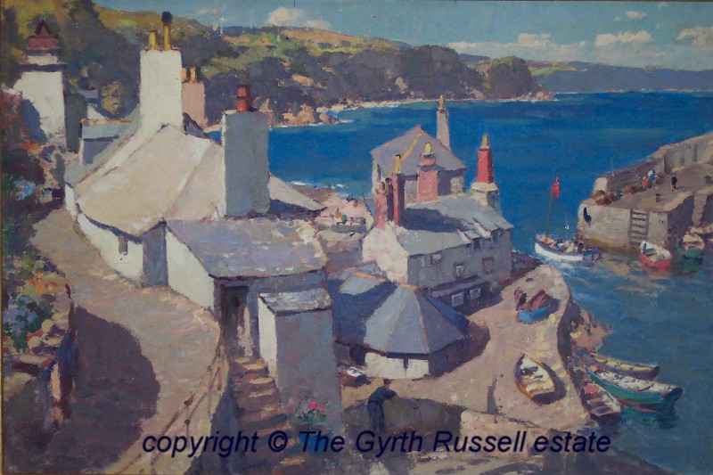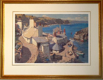 www.gyrth-russell.com - Limited Editions Presenting a select few of Gyrth Russells best works , on high quality watercolour paper using the `Giclee` printing process reported to have a lightfastness in excess of 100 years . Each print is supplied either unframed but with an acid-free overmount and cellophane wrapped or fully framed and ready to hang . Each print is numbered and comes with a certificate of authenticity from the Gyrth Russell estate. Title : `An impression of Cornwall` Capturing the beautiful clear air and vivid colours of the Cornish coastline this impressive large oil was commissioned by British rail to convey the feel and atmosphere of Cornwall , not to be of anywhere specific but a compilation of differing aspects of a typical Cornish harbour scene. Image size : 16" x 23.1/2" " ( 406 x 596 mm ) - Mount size : 23.1/2 x 30.1/2 " ( 596 x 775mm ) Original Medium : Oil on canvas - Limited edition of : 200 The frames available are either a Rich Dutch gold leaf finish with hints of the red base colour coming through or our hand-painted pastel grey finish with Dutch gold leaf inner edge again on a warm red base colour ( see `Rouen Cathedral porch` limited edition page) back to `Limited Editions` page..